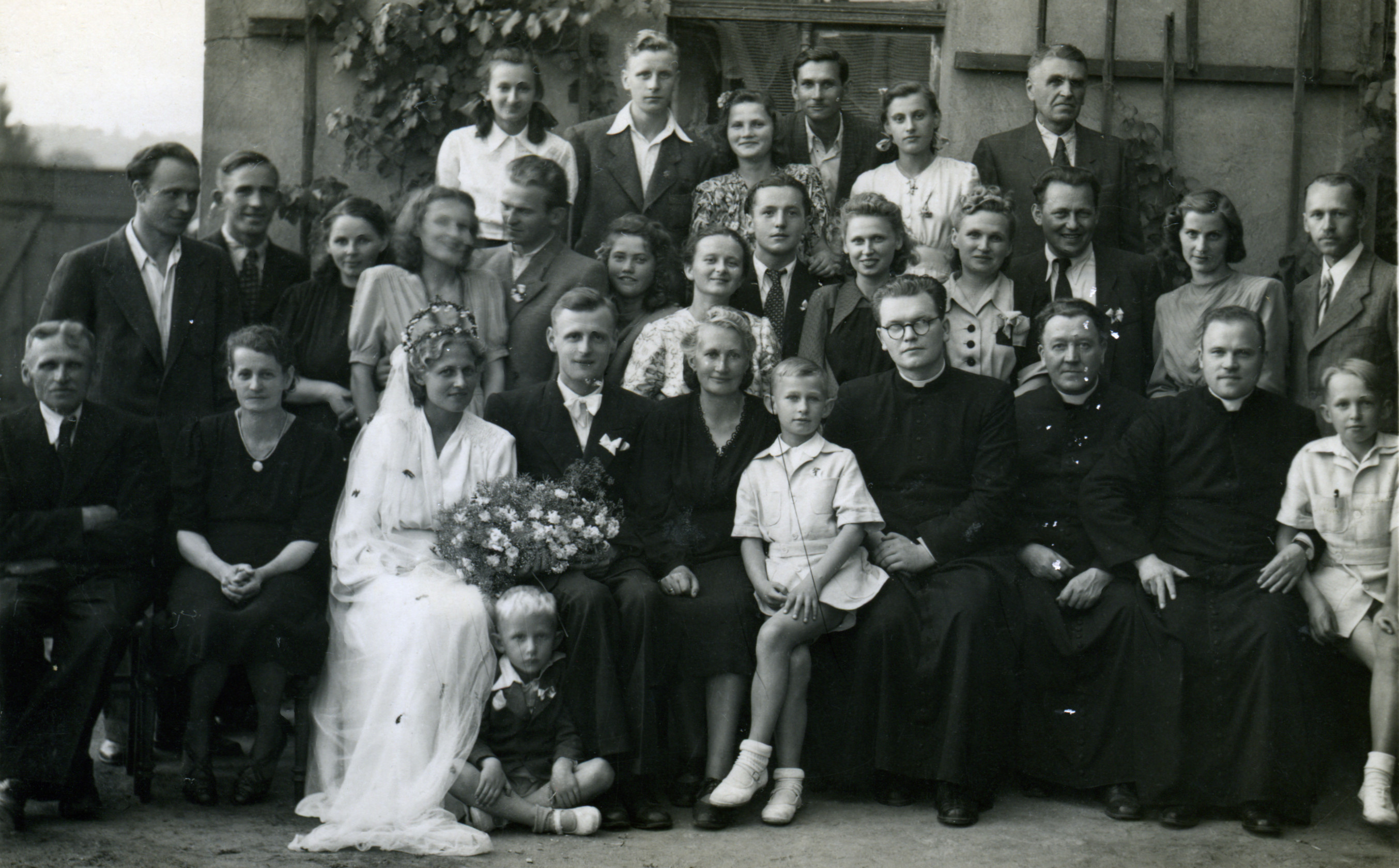 Na zdjęciu goście weselni - od lewej strony: pierwszy - stryjek, trzecia Alinka, czwarty Zdzisław Lenart, piąta stryjenka. Dalszych trzech osób nie znam, ale stali tam goście całej bardzo pobożnej rodziny, księża. Za nimi stoją: czwarta Jasia, dziewiąta Hela, dziesiąta Ludka i trzynasty Zygmunt Jagiełłowicz. W ostatnim rzędzie stoją: pierwsza Irena, szósty tato.