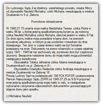 Cóż do tego dodać. Chyba to, że ciocia Hela Rewkowska (Niedzińska), przeciw której to matactwo było skierowane, opłacała przez całe lata naukę dzieci cioci Michaliny Neufeld (Niedzińskiej): Stacha, Piotrka i Janki. Pomagała im jak mogła, bo byli zawsze byli biedni z powodu pijaństwa wujka Juliana, oraz braku gospodarności Michaliny. A teraz doszła do tego ta bezczelność.