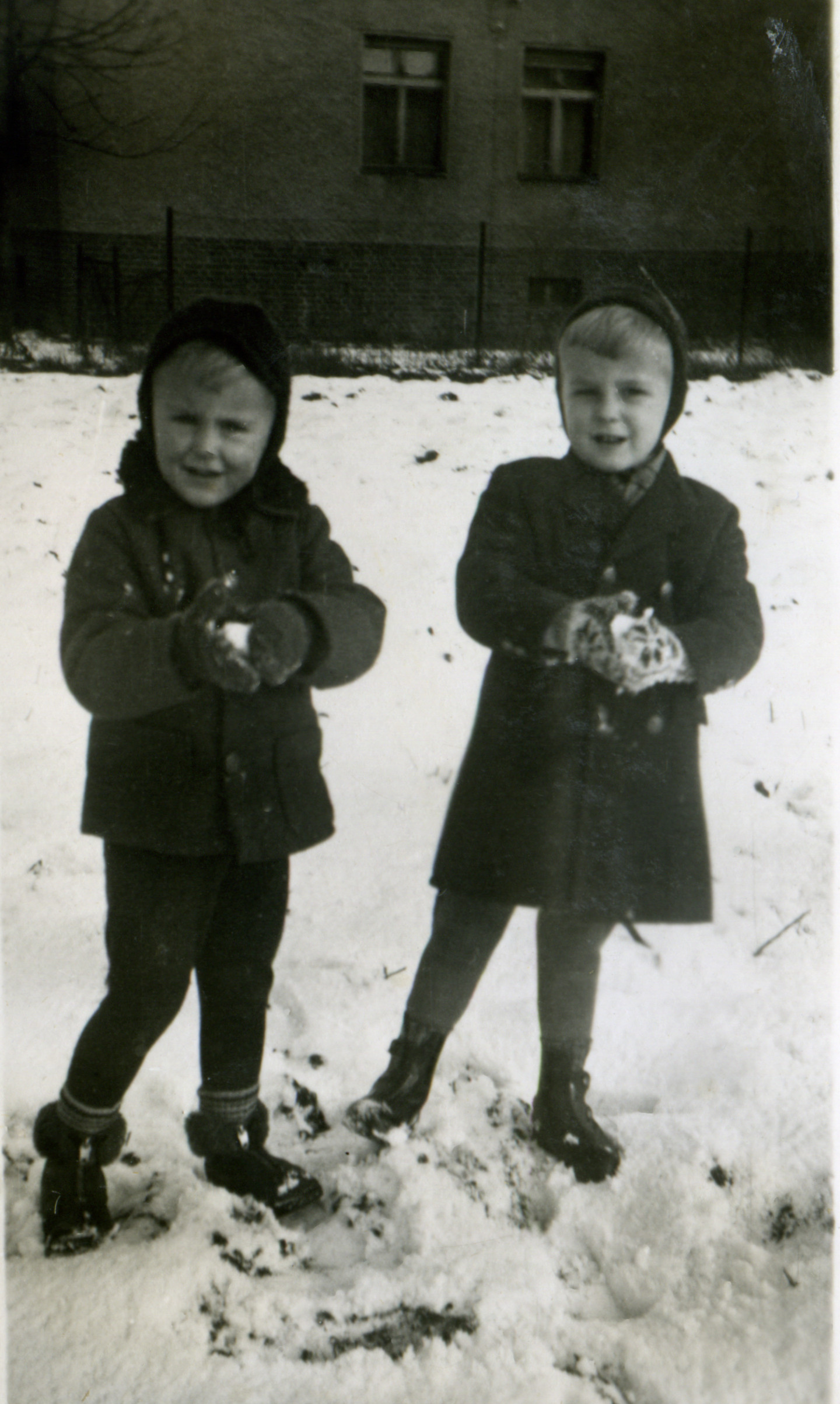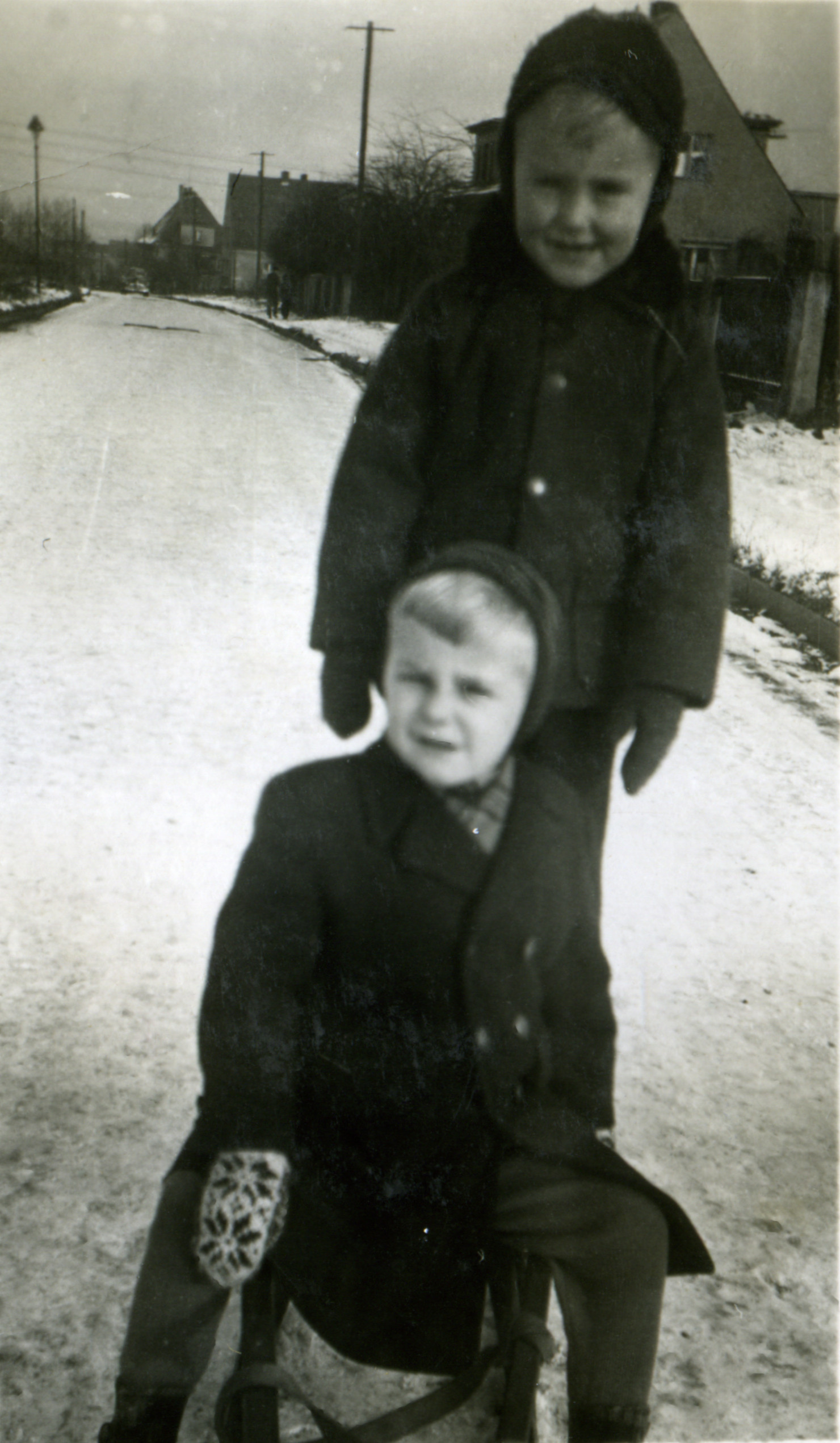 Krzyś Zdanowicz, z kolegą z podwórka na sankach