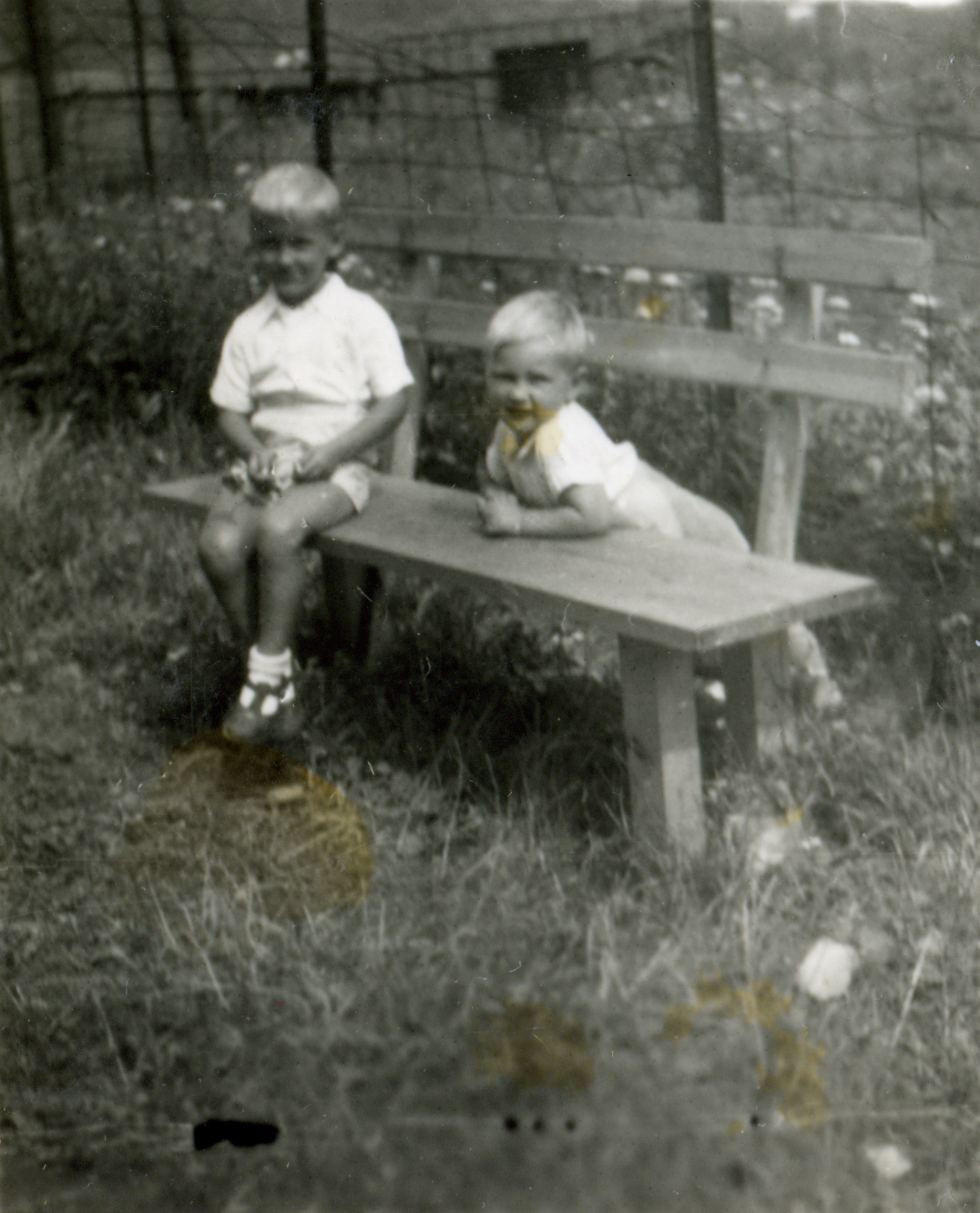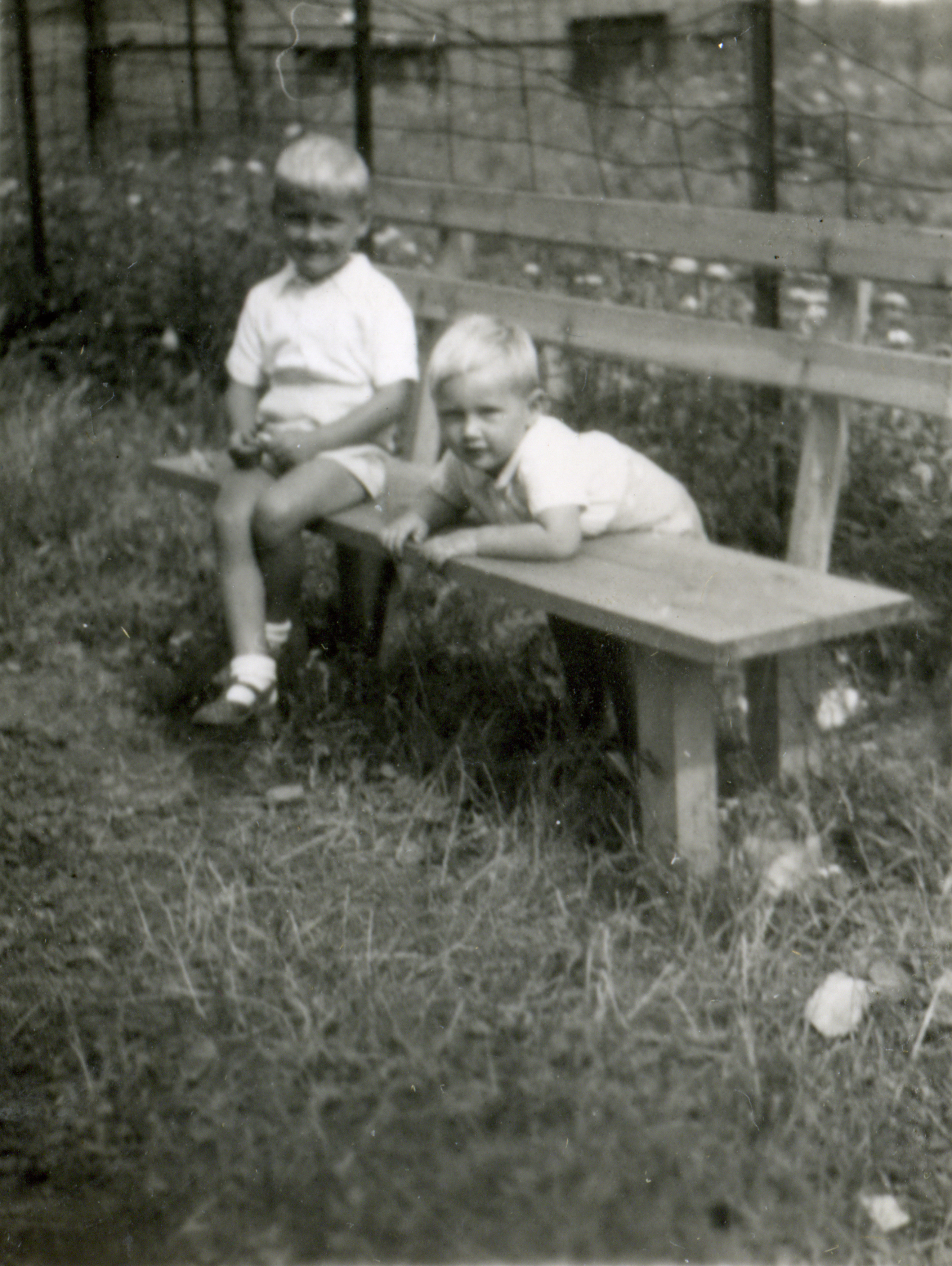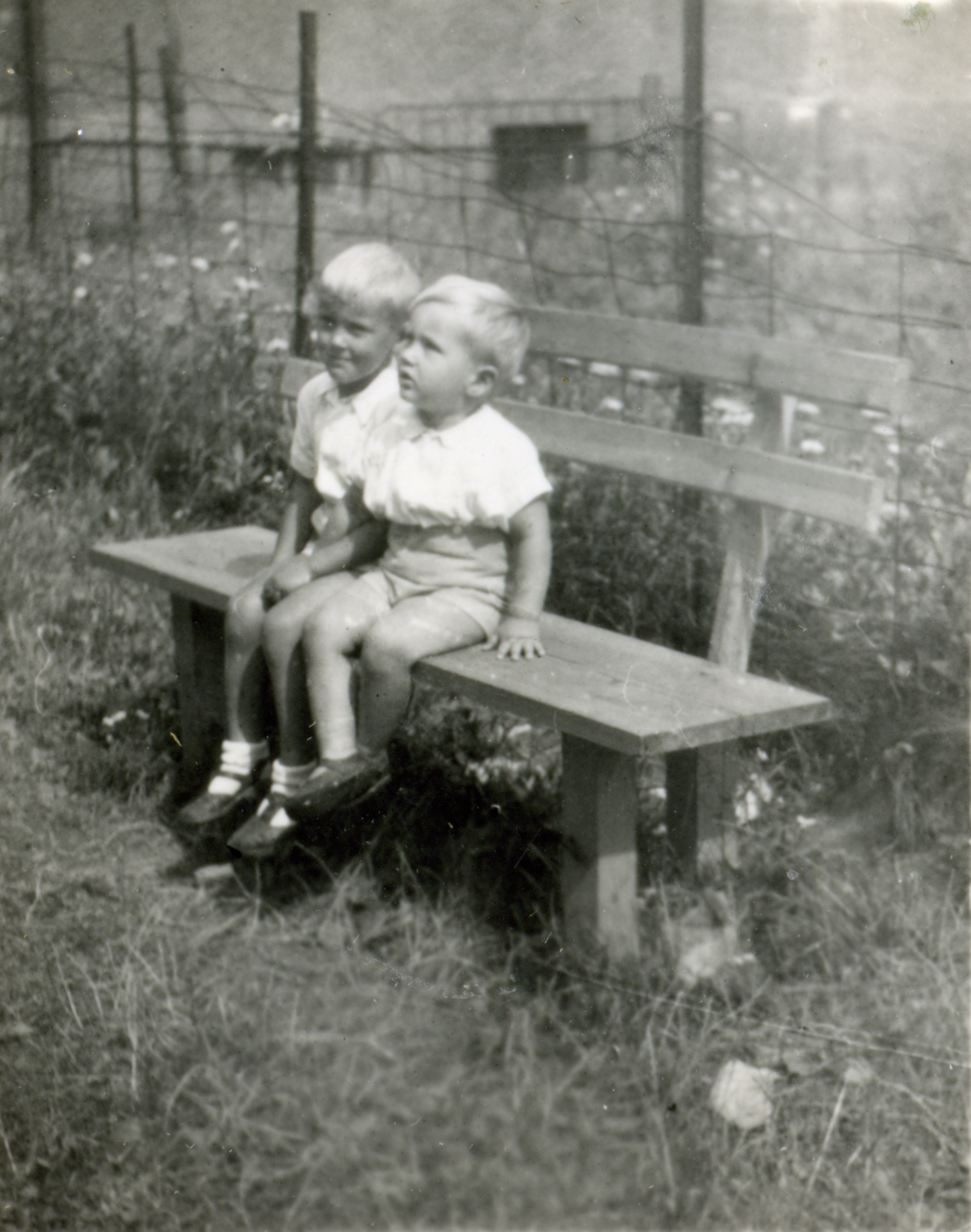 Krzyś i Wojtek Zdanowiczowie na ławeczce przed domem w Gliwicach przy ulicy Bolesława Śmiałego 4/2;