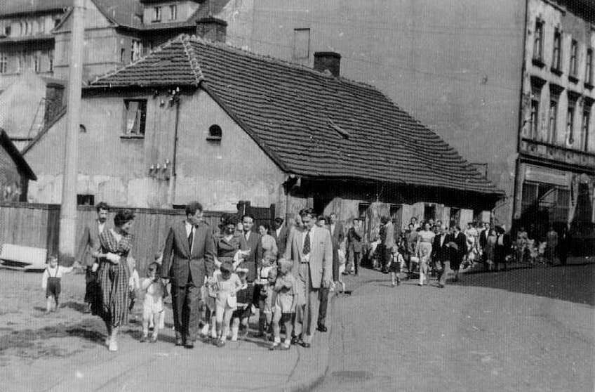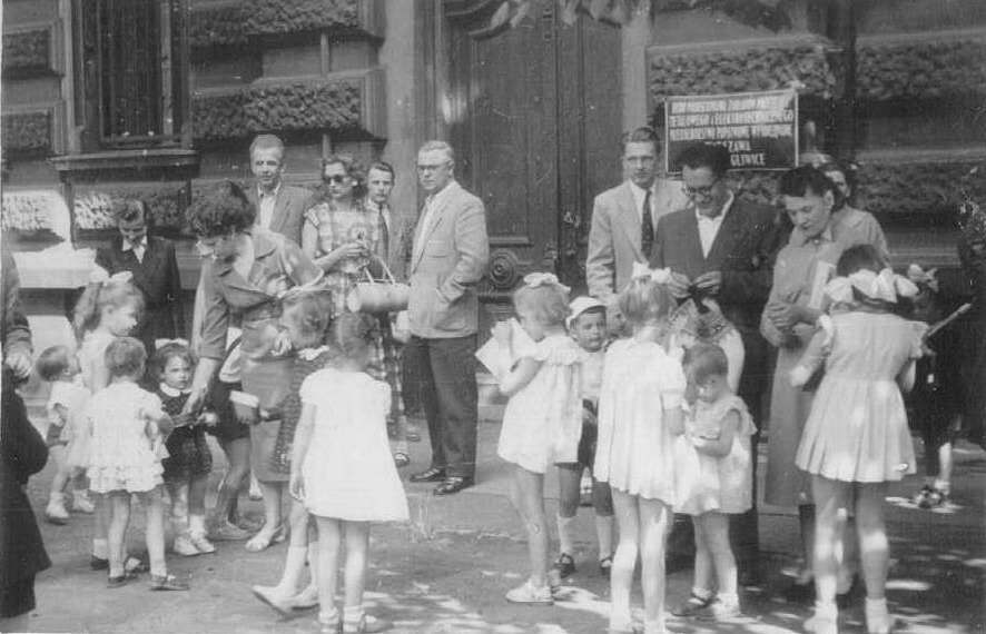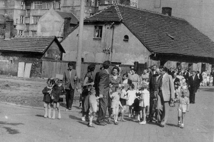 Trochę zdjęć jeszcze sprzed wakacji, bo na dzień dziecka - 1 czerwca 1956 roku. Byłem bez Jasi, ale za to z synami, na imprezie zorganizowanej przez Prozamet w sali Szkoły Muzycznej przy ul. Wieczorka, naprzeciw pomnika Adama Mickiewicza: