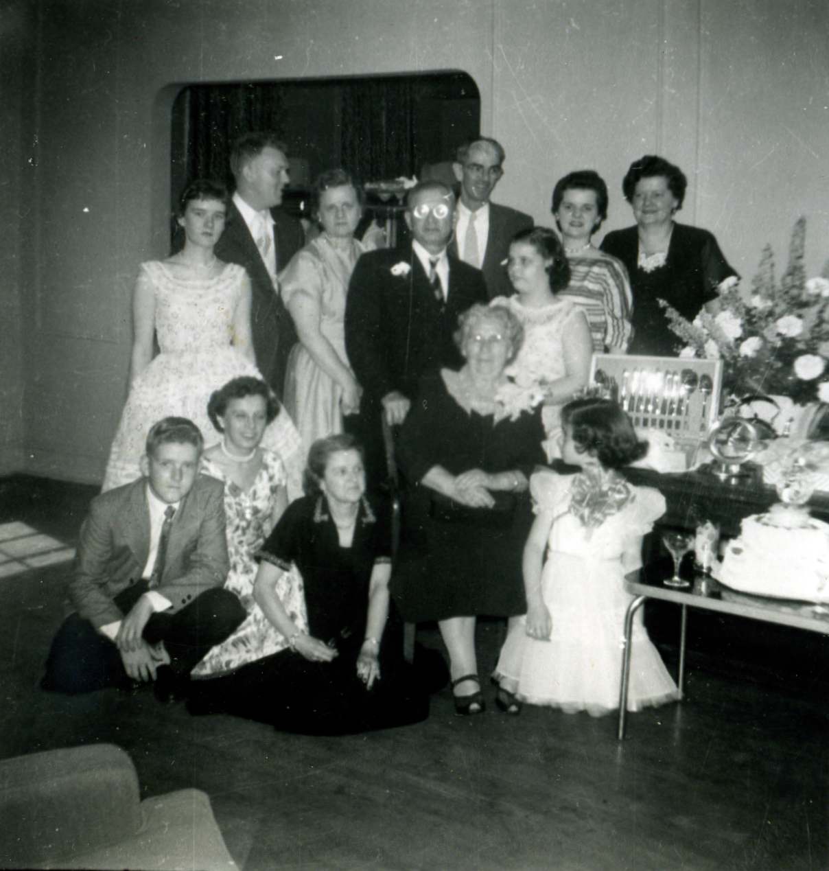 Michalina z Niedzińskich (siedzi w środku) i Jan Miśkiewiczowie (stoi w środku) w otoczeniu rodziny w Nowym Jorku ;