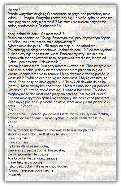 Ciocia Helena Rewkowska (Niedzińska) otrzymała list od swojego brata Zenona Niedzińskiego napisany z Domu Inwalidów, mieszczącego się na stacji Tancidejskiej w rejonie Jermakowskoje, poczta Grigoriewska w kraju Krasnojarskim w ZSRR. Był jeszcze dalej niż siostra Anna. Chorował na gruźlicę.