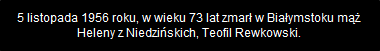 Od 31 października 1956 roku, wujek Teofil Rewkowski nie czuł się dobrze. Nie chodził do pracy. Prywatny lekarz, który pracował w klinice na stanowisku kierowniczym skierował go do kliniki. Na następny dzień ciocia Helena zawiozła go do tam. 5 listopada 1956 roku, tuż po wizycie żony, wujek umarł.