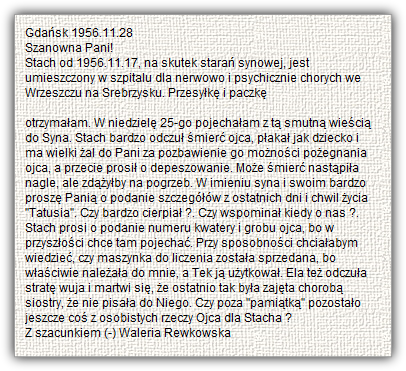 Stanisław Rewkowski, syn Wiktorii i Teofila Rewkowskiego, nie wytrzymał psychicznie napięcia w pracy "socjalistycznej". Był bardzo zdolnym inżynierem elektrykiem i wynalazcą. Został zakrakany przez zawistnych kolegów. W końcu zachorował i został 17 listopada 1956 roku umieszczony w szpitalu dla nerwowo i psychicznie chorych w Gdańsku Wrzeszczu, na Srebrzysku przez swoją żonę i matkę.