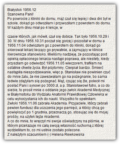Dokument 328 ; Dokument przekazania zwłok wujka Teofila Rewkowskiego do Akademii Medycznej w Białymstoku ; 8 listopad 1956 roku ;